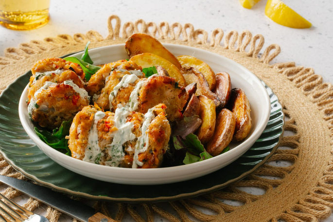 Turn salmon cakes into delectable appetizers by making them bite-sized and layering them with an herby creme fraiche. Serve alongside roasted fingerling potatoes to make it into a meal.