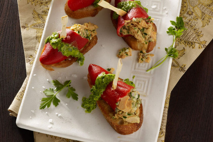 Delight your guests with these vibrant Piquillo Peppers stuffed with a zesty wild Alaska salmon mixture, topped with a fresh parsley sauce and served on toasted baguette slices for a burst of flavor.